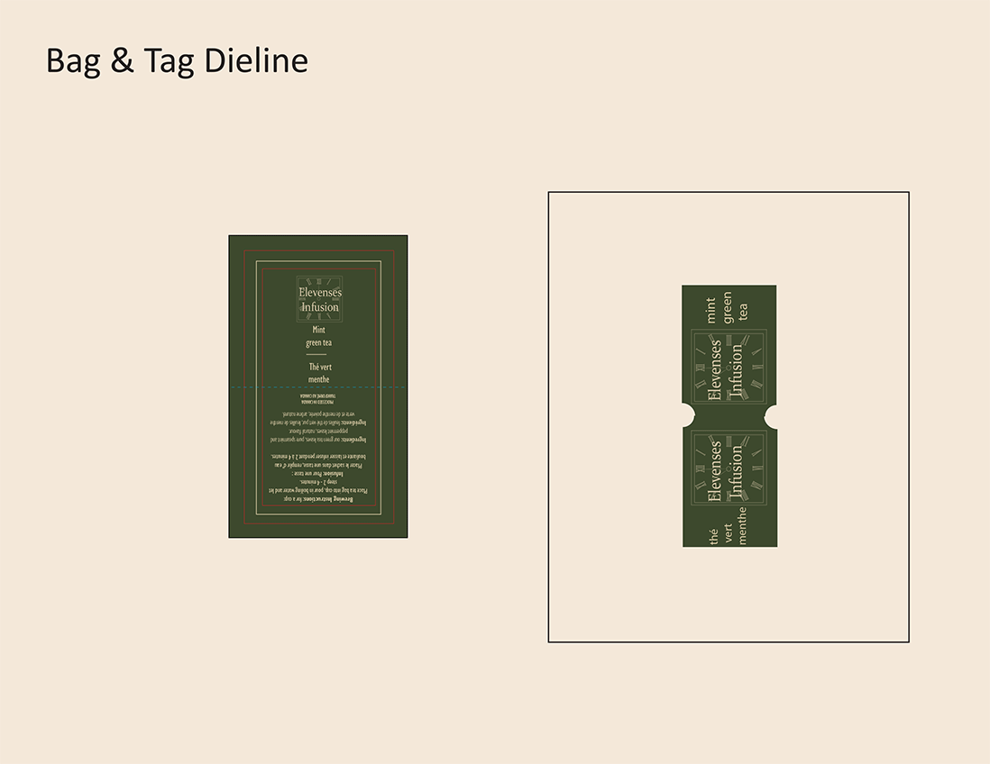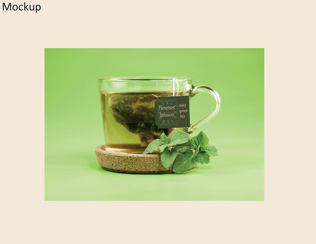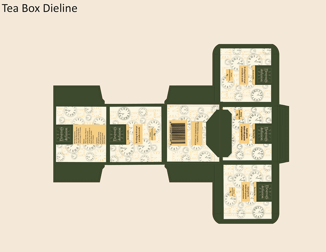 Development of a new Green Tea packaging and name was required for this project. The name was inspired by the morning tea-break observed mid-morning in some countries and referred to as "elevensies" in Britain. I used a clock set to 11 as the background image and green as the colour palette as it was a green tea product. The gold paired well with the green and also with the clock/watch imagery.